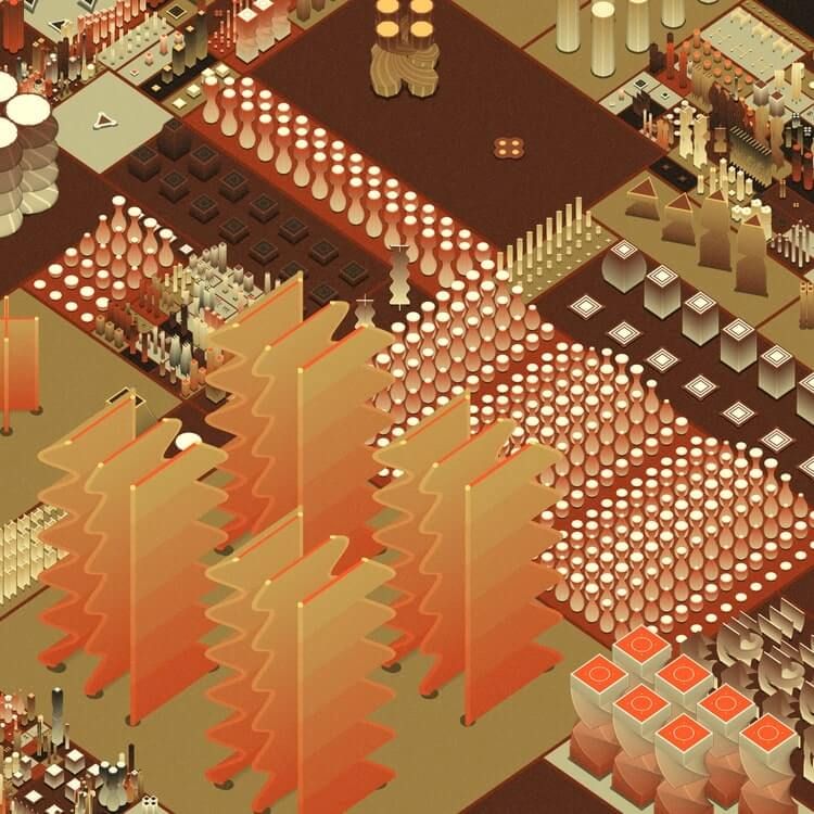 With every piece, a world of complex geometries and colors evolves, drawing the viewer into a futuristic cosmos of order and chaos.